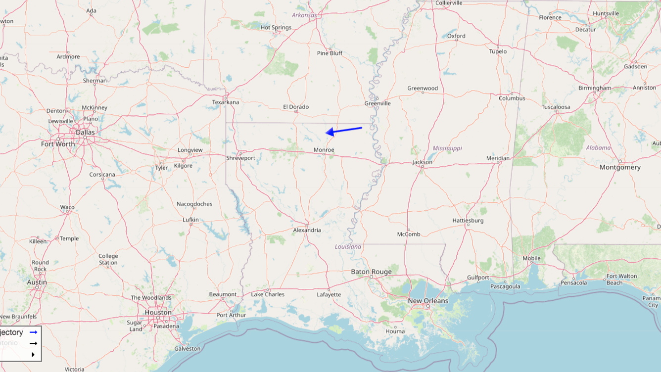 The blue arrow indicates the trajectory of the fireball that streaked west across northeastern Louisiana on March 2.
